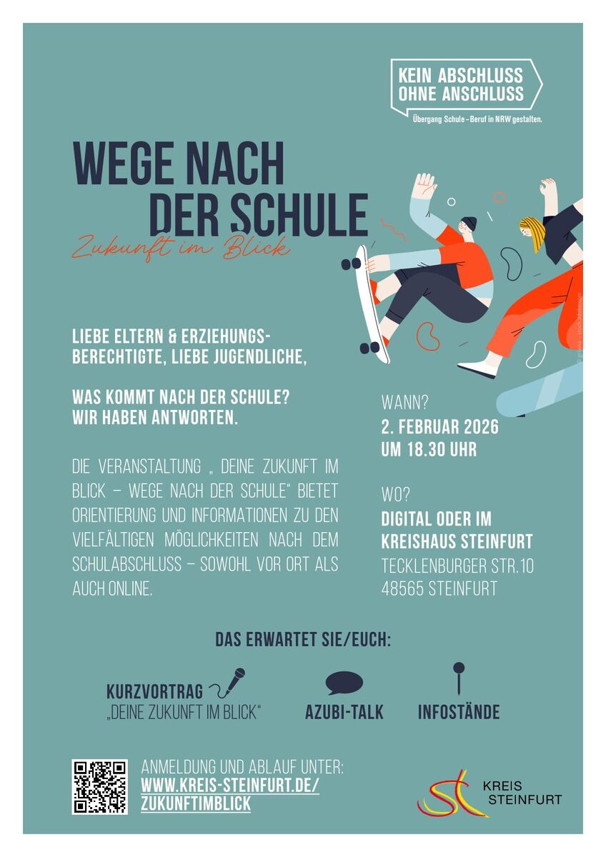 Einen Einblick in die Möglichkeiten nach dem Schulabschluss gibt die Veranstaltung „Zukunft im Blick: Wege nach der Schule“, die am 02.02.2026 um 18:30 Uhr im Kreishaus in Steinfurt sowie digital stattfindet.
