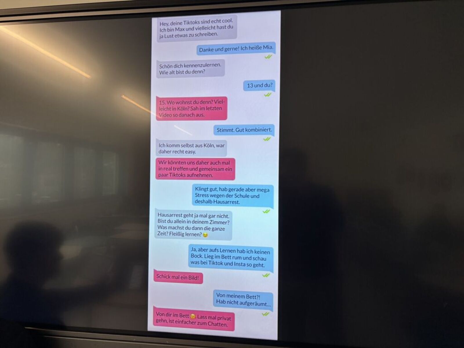 In weiteren Workshops geht es um typische Vorgehensweisen von Täterinnen und Tätern. Die Schülerinnen und Schüler lernen, wie Vertrauen aufgebaut wird – durch Komplimente, Aufmerksamkeit, kleine Geschenke oder den Wunsch nach Geheimhaltung. Anhand von Fallbeispielen überlegen sie, wann ein Kontakt problematisch wird und welche Warnsignale ernst genommen werden sollten, etwa der Druck, private Fotos zu verschicken oder sich im „echten Leben“ zu treffen.